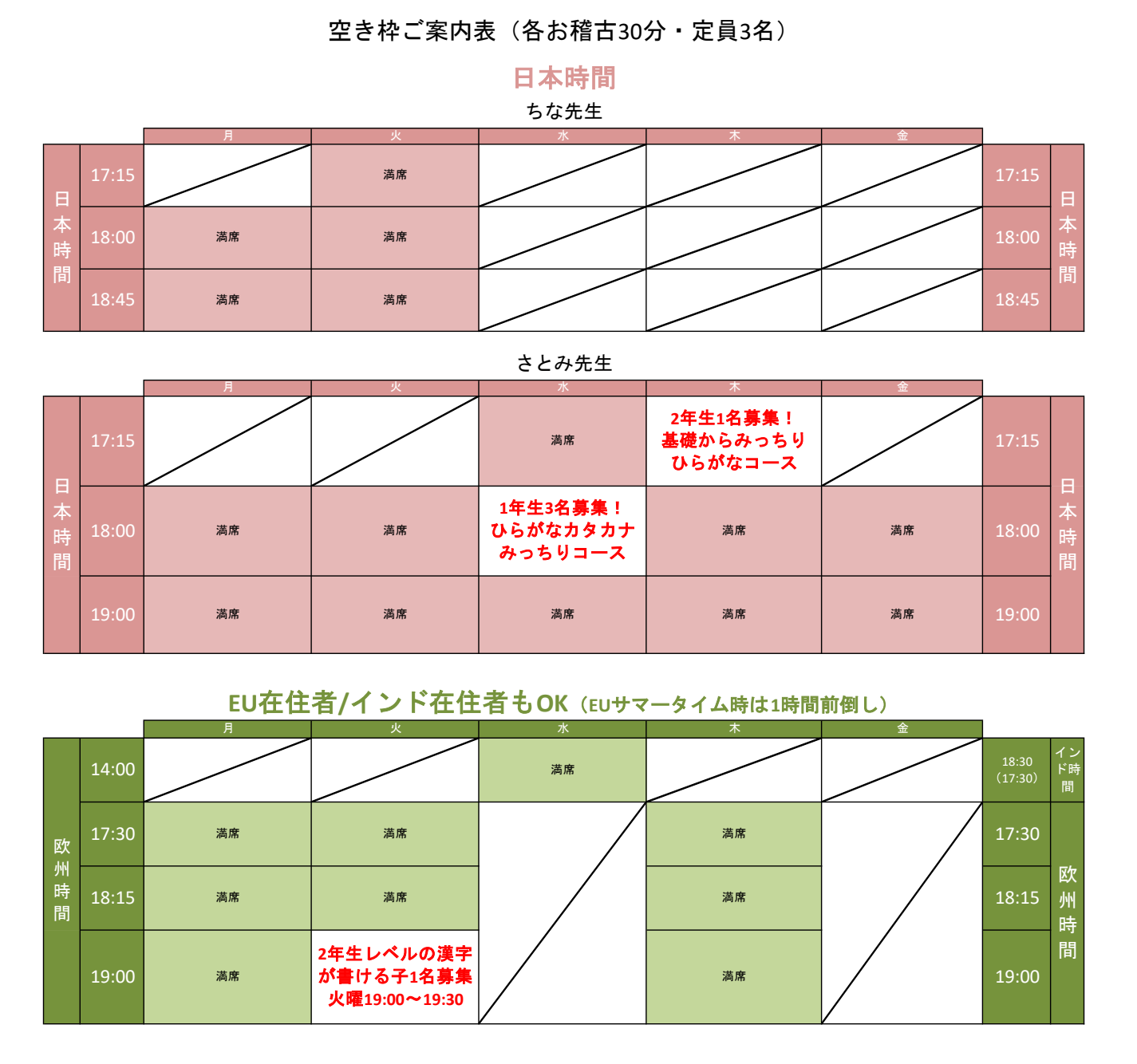 ご入会希望のかたは上記の表をご覧になり、お子さんのご予定にあうお稽古空き枠があるかどうかご確認ください。表はときどきリニューアルする予定ですが、アップロードの遅れがありますので、お問い合わせをいただいた時点でお返事をいたします。