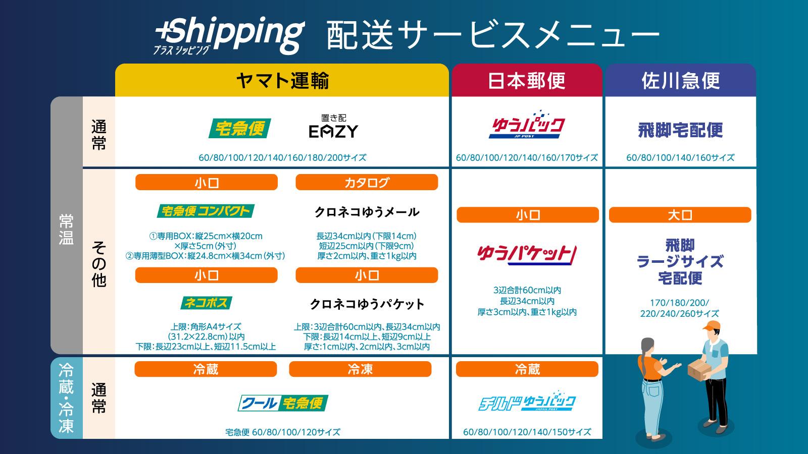 国内三大宅配会社に対応し、あらゆるサイズ、冷凍冷蔵、置き配までフルラインナップでの 配送モードをご利用可能です。