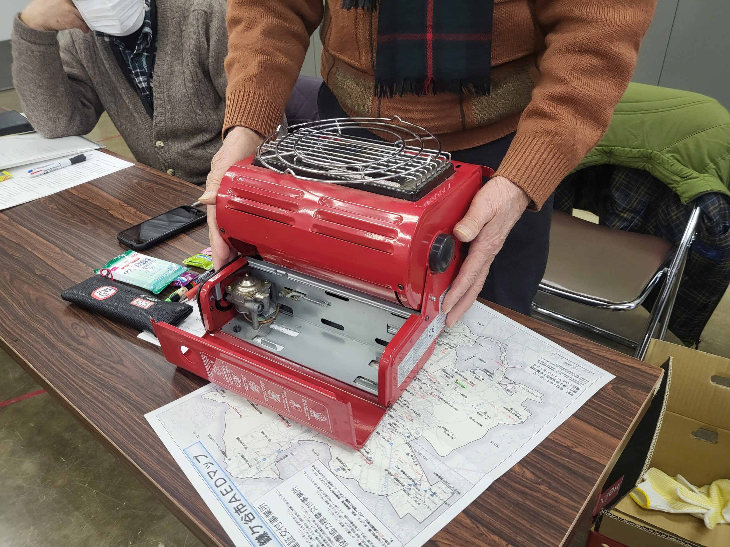 鎌ケ谷消防署の①消火器訓練、②肺蘇生とAED訓練、③煙体験訓練と