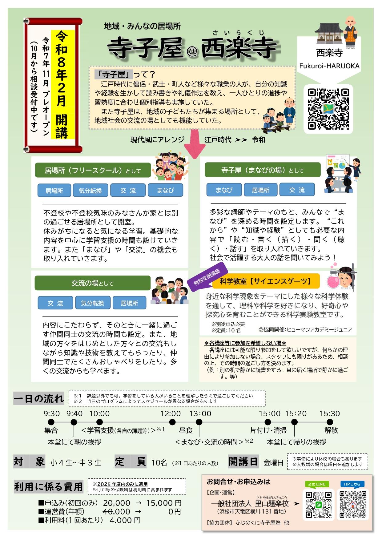 **新着** 袋井市にある西楽寺にて「寺子屋」を開講します!ご相談・申込受付中! 詳細は下記をご覧ください⭐︎ |