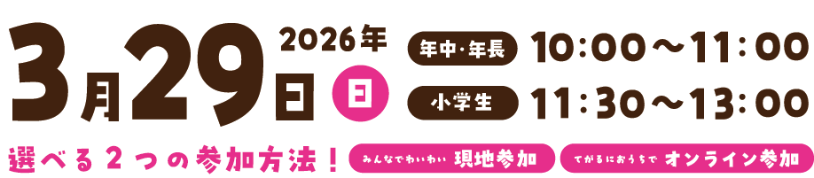 2026年3月29日(日) 『年中・年長』10:00~11:00 『小学生』11:30~13:00 |