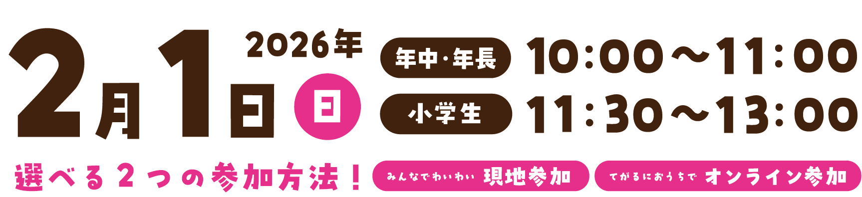 2026年2月1日(日) 『年中・年長』10:00~11:00 『小学生』11:30~13:00 |