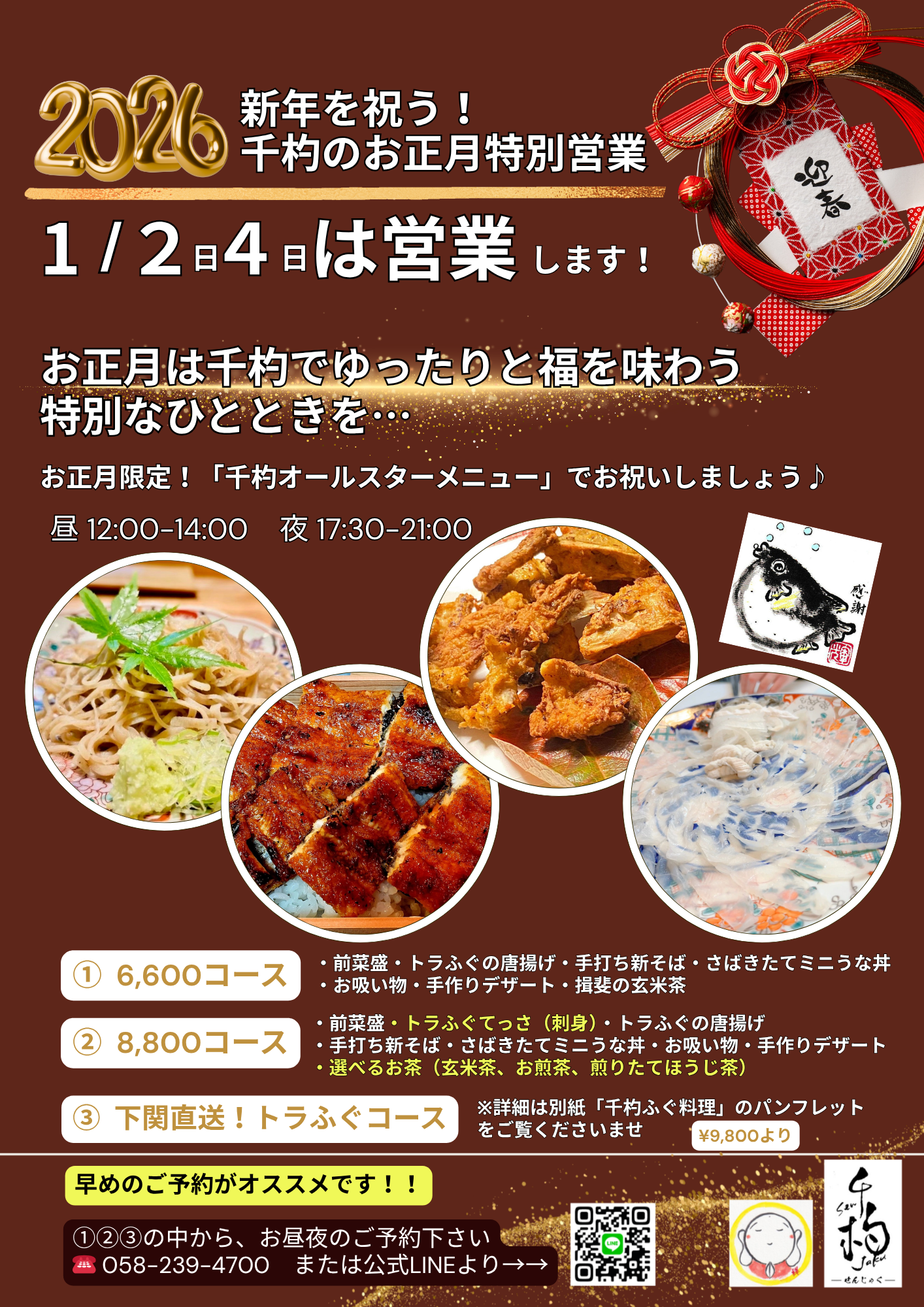 2026年お正月は1/2(金)1/4(日)のお昼・夜営業いたします。新年を祝う⭐️お正月・特別営業日となります。