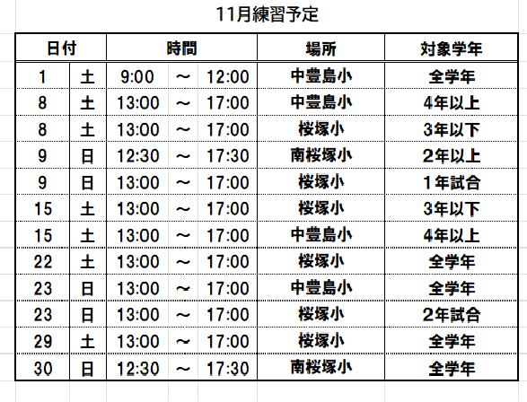 ☆☆☆練習日程☆☆☆2024年5月 4日(土) 9時~12時 中豊島小(全学年) 5日(日) 9時~17時 豊中三中(全学年) 11日(土) 13時~17時 中豊島小(全学年) 12日(日) 12時30分~17時30分 南桜塚小(全学年) 18日(土) 13時~17時 中豊島小(全学年) 19日(日) 13時~17時 豊中三中(4年以下) 25日(土) 13時~17時 桜塚小(全学年) 26日(月) 13時~17時 桜塚小(3年以下) 13時~17時 中豊島小(4年以上)