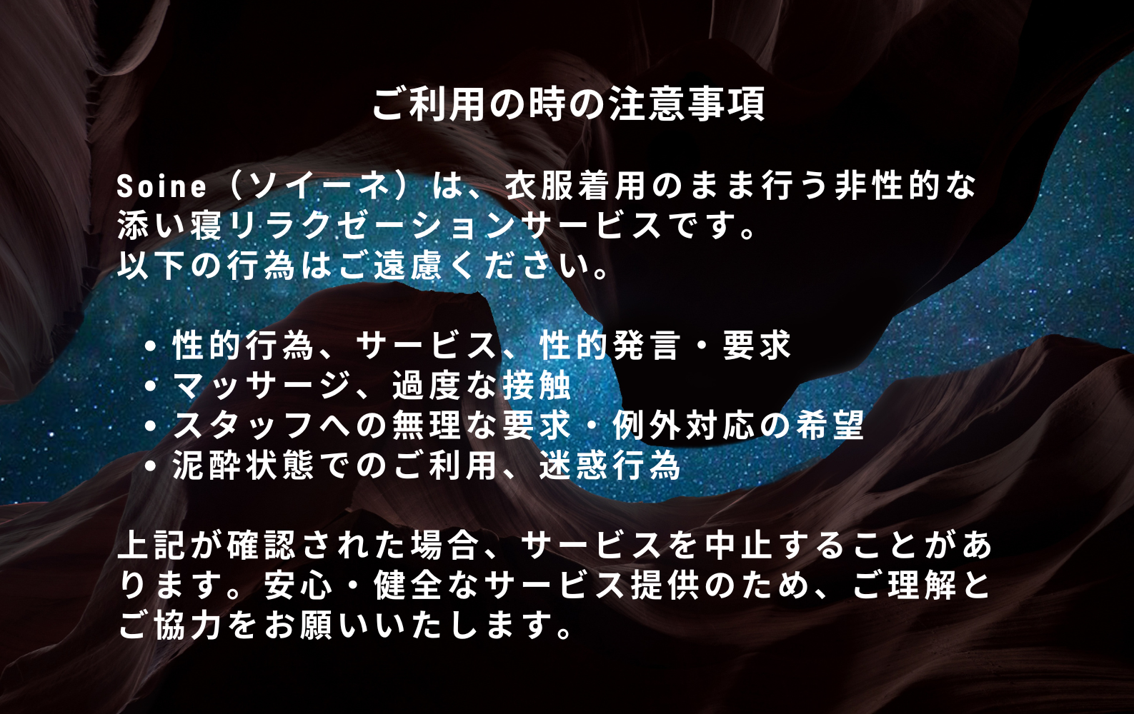 Soine(ソイーネ)は、衣服着用のまま添い寝を行う、リラクゼーションサービスです。安心感と休息を目的としています。