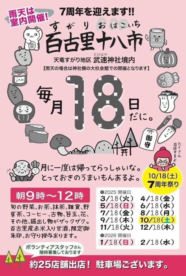 浜松市天竜区の小さな里山集落、百古里(すがり)での小さな【朝市】です。『将軍杉』と呼ばれる樹齢千年を超える大杉のある武速(たけはや)神社が会場です。神社にお参りしてから運気が上がったという方も多く、パワースポットとしても注目されています。