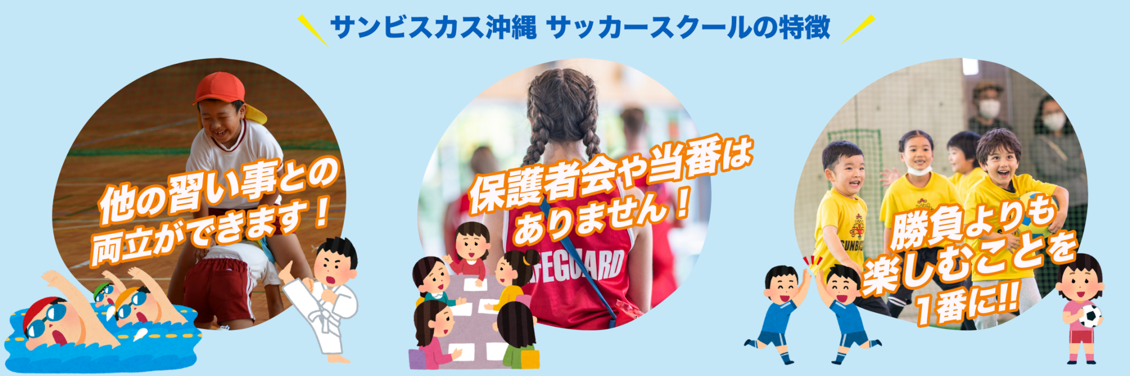 サンビスカスサッカースクールでは、発育発達に特化したメニューが豊富で、沖縄県内25園の保育園・幼稚園にもその運動あそびのカリキュラムを取り入れていただいています。