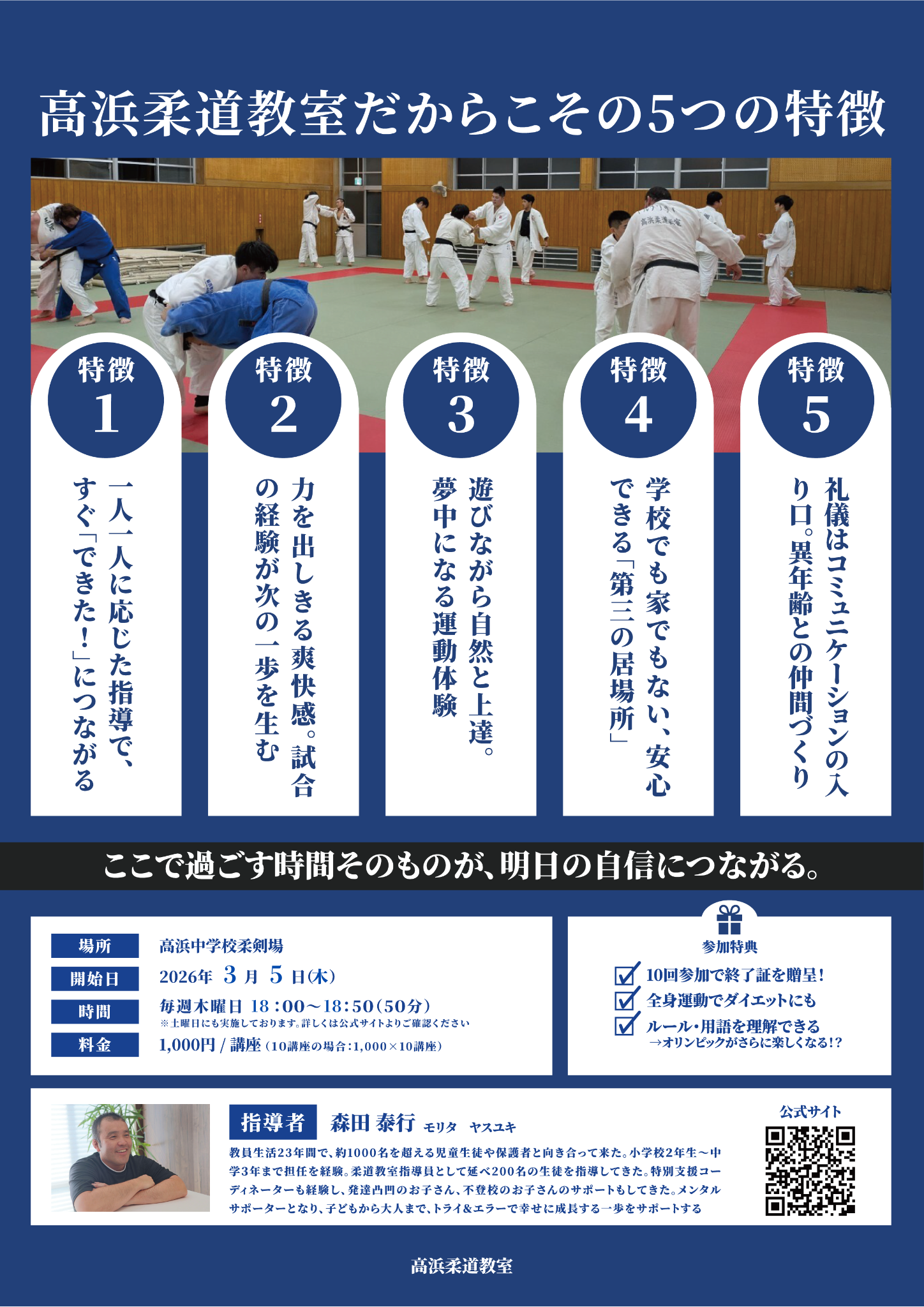 | 活動場所 | 愛知県高浜市二池町3丁目3-2 高浜市立南中学校 柔道場 ※木曜日は、高浜中学校で行う |
