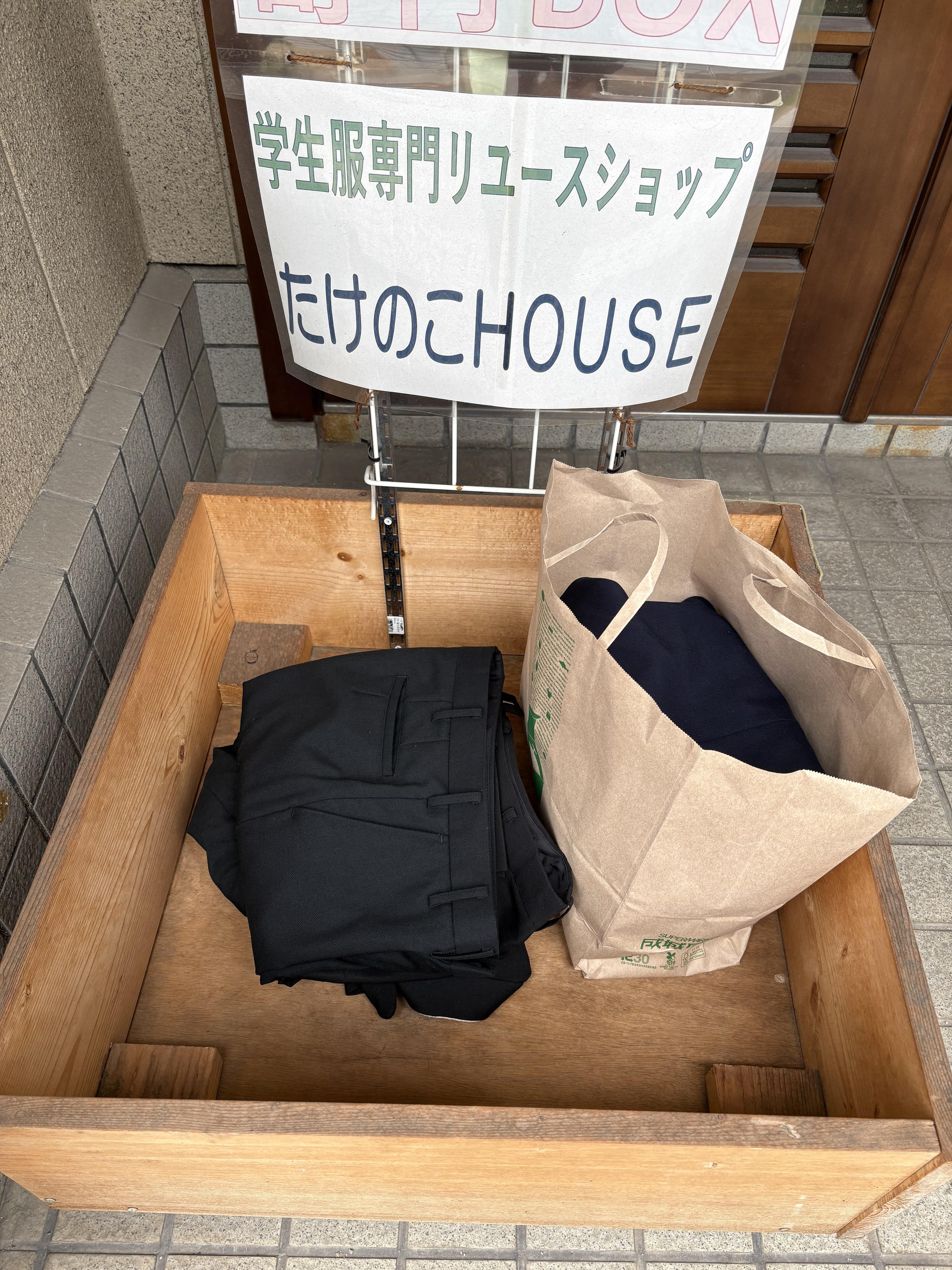 店舗前に制服寄付BOXを設置しました。査定は必要ないけど捨てられない制服があるとう方いらっしゃいましたら24時間365日いつでもこの箱に制服を入れていただけます。