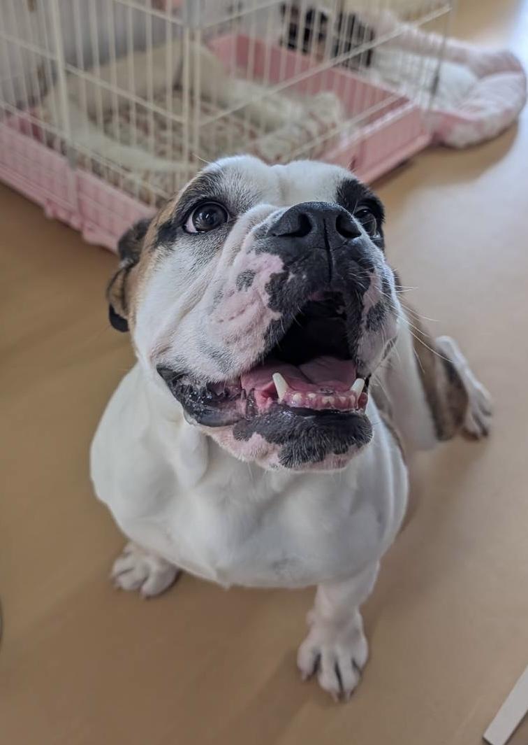 【詳細】人懐っこく明るく元気な子です。人も犬も好きでどのわんちゃんとも仲良く出来てます。ごはんもしっかり食べてくれて、おやつも大好き食いしん坊です。日中は部屋の中をウロウロと歩き回り、疲れたら自分でクレートに入って寝たりベッドで寝たりしています。