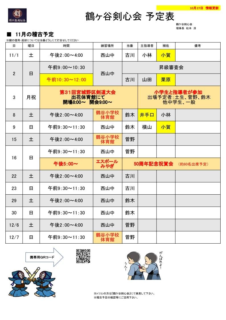 1.11月の稽古予定表ができました。(指導者予定、確定しました。)