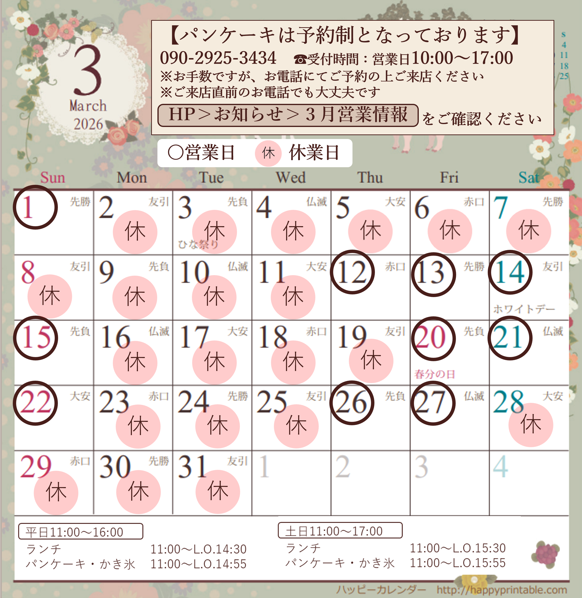 | 営業時間: | ※時期によりかき氷・ドリンクのラストオーダーの時間が変わります。 ◆平日11:00~16:00 ランチ 11:00~14:30 パンケーキ 11:00~14:55L.O. かき氷 11:00~14:55L.O. ◆土日祝日11:00~17:00 ランチ 11:00~15:30 パンケーキ 11:00~15:55L.O. かき氷 11:00~15:55L.O. |