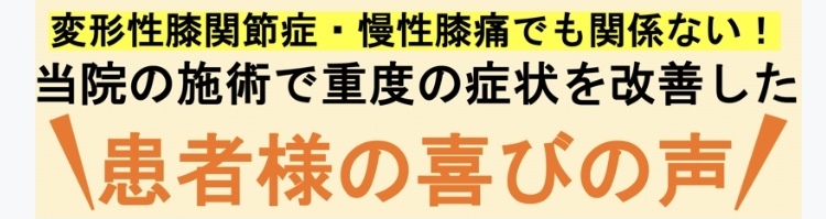 ※患者様の体験レポートは、個人の感想になります。当院では、患者様の膝痛症状や状態に合わせた施術等を行っております。