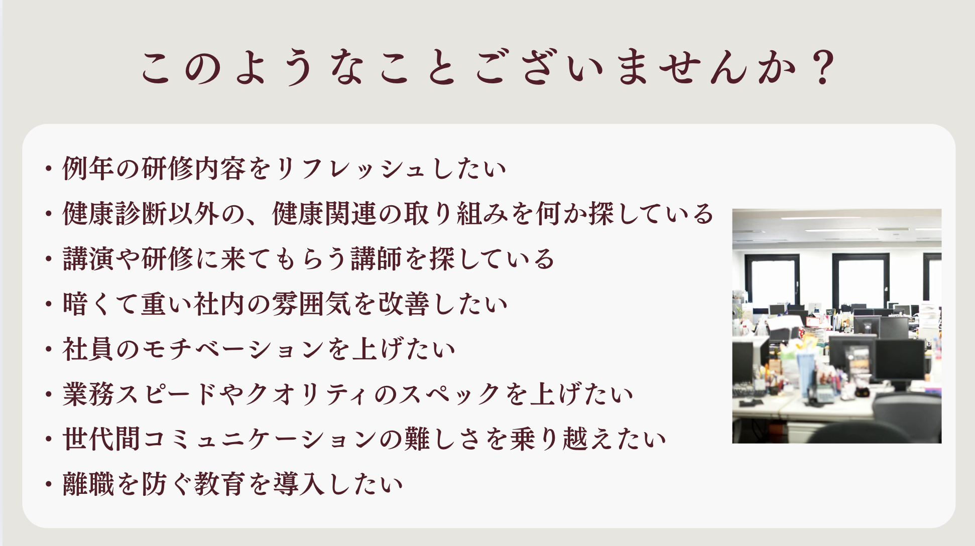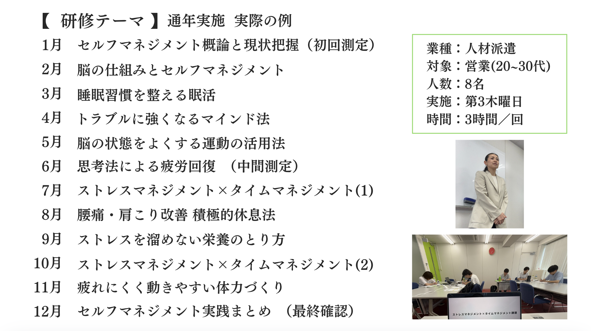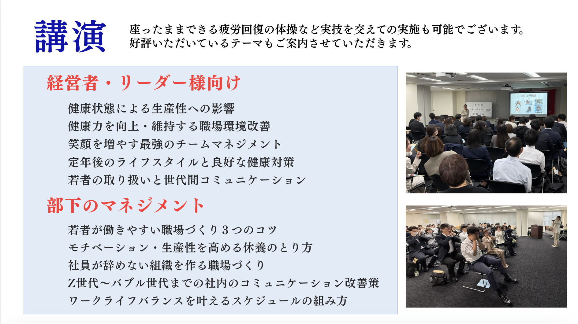 職業柄、肉体疲労が高めなのは当たり前なのですが、肉体疲労のリカバリー法だけでは不十分であることを教えてもらったことが目から鱗でした。ちょっとした意識と生活の中での工夫によって疲労を軽減できるようになり、職場のメンバーも巻き込んだところ喜ばれた。共通言語で今も継続できていることが有り難い。