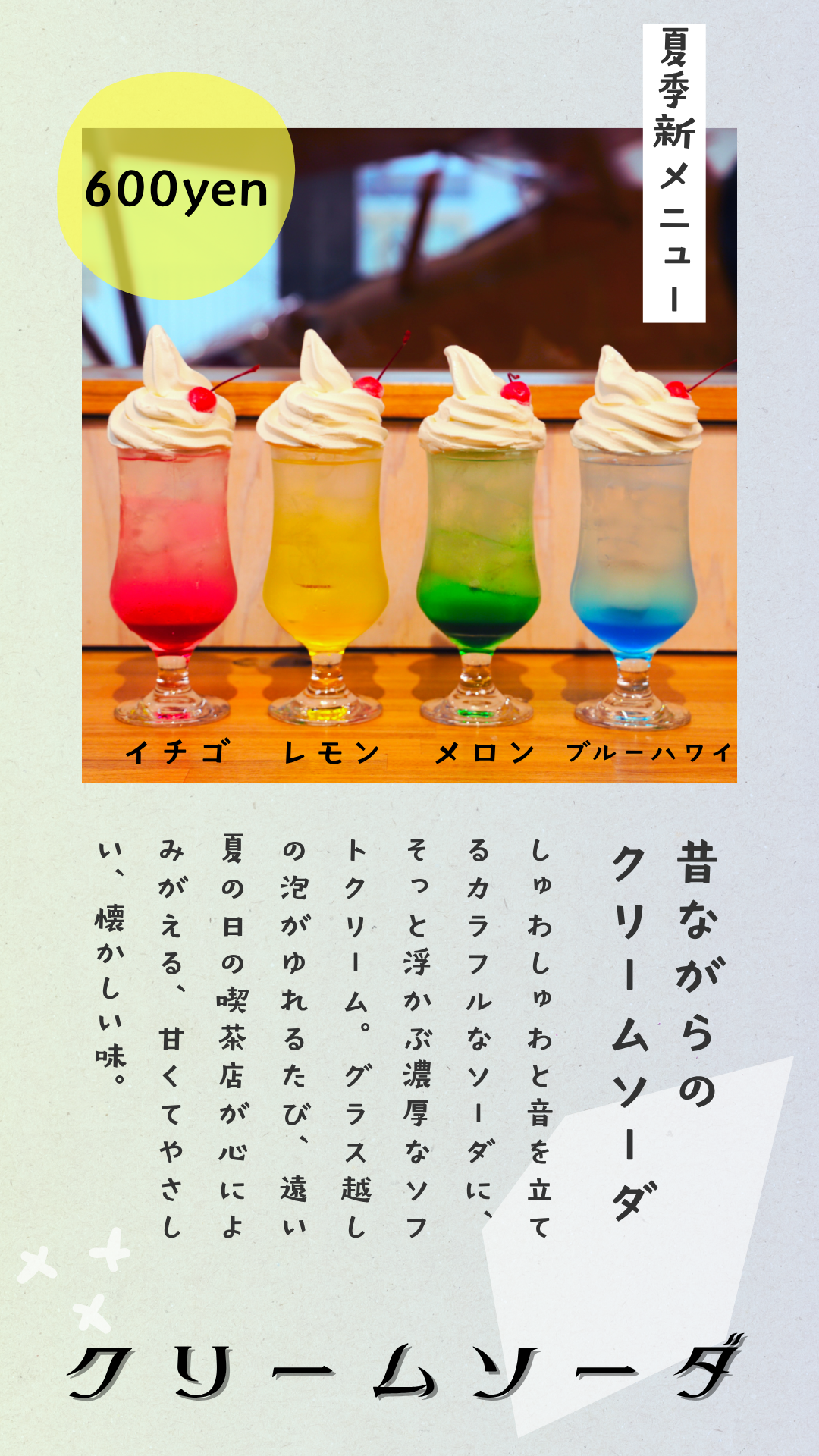 夏季新メニュー!!「クリームソーダ」の販売開始!!イチゴ、レモン、メロン、ブルーハワイの4種類♪