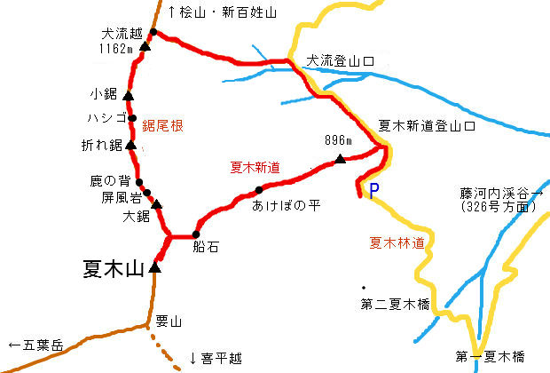携帯電波可能域(au) | 藤河内渓谷温泉・登山口(微弱)・アケボノ平・シャクナゲ平・船石・縦走尾根分岐・山頂(微弱) |