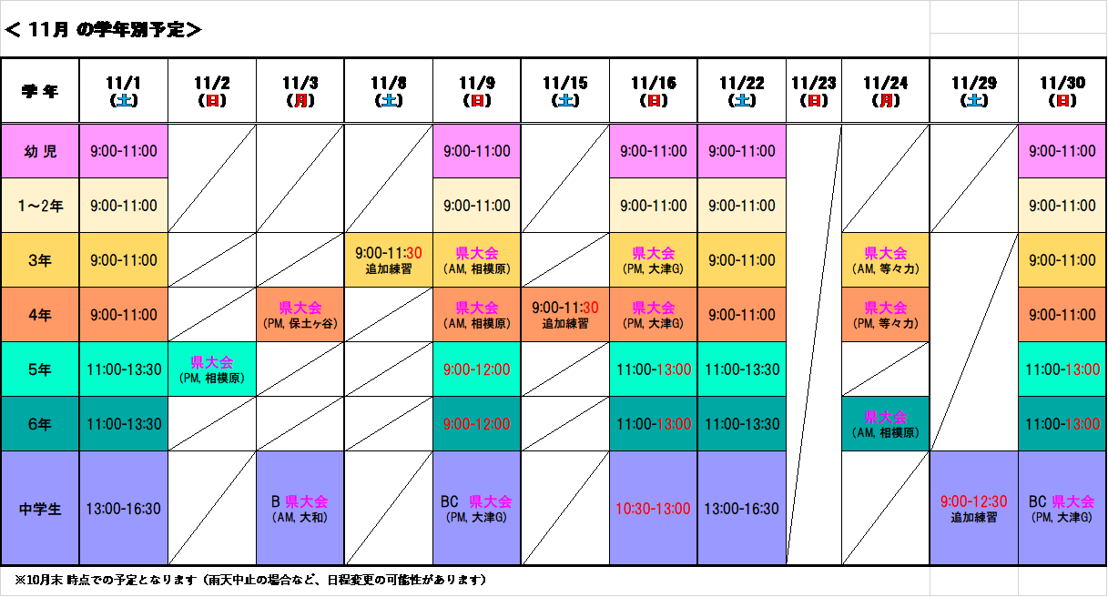 11月中の試合は外部での開催も多いため、各学年コーチの指示に従ってください。