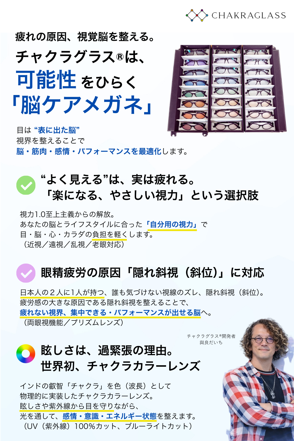 自身が目で苦労(近視、乱視、不同視、外斜位、上下斜位、回線斜位)してきて、ずっと眼鏡難民をしてきた。ある時出会った眼鏡が、世界と自分を変えてくれた経験を持つ。自分を同じ悩みを持つ人たちの力になりたく、45歳で素人から眼鏡屋に転身。独自の経験を活かした検眼コンサルティングを行い、一人ひとりに合ったカスタマイズな眼鏡を4000人以上に届けてきている。