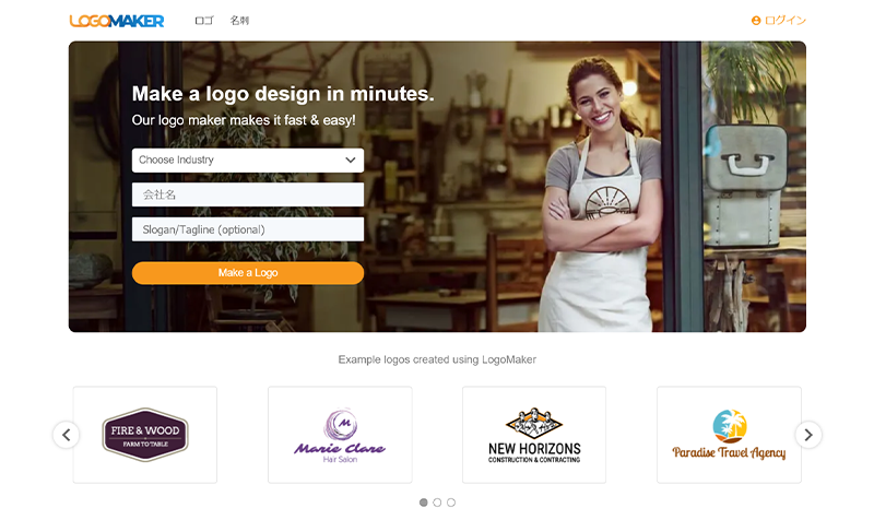 会社名と業種の入力をするだけでデザインの候補が出てくるので、早く簡単にロゴを作れます。出てくるデザイン候補の数が多いのもうれしいです。アルファベットだけでなくかな文字や漢字にも対応していますが、かな文字と漢字のフォントは1種類のみです。