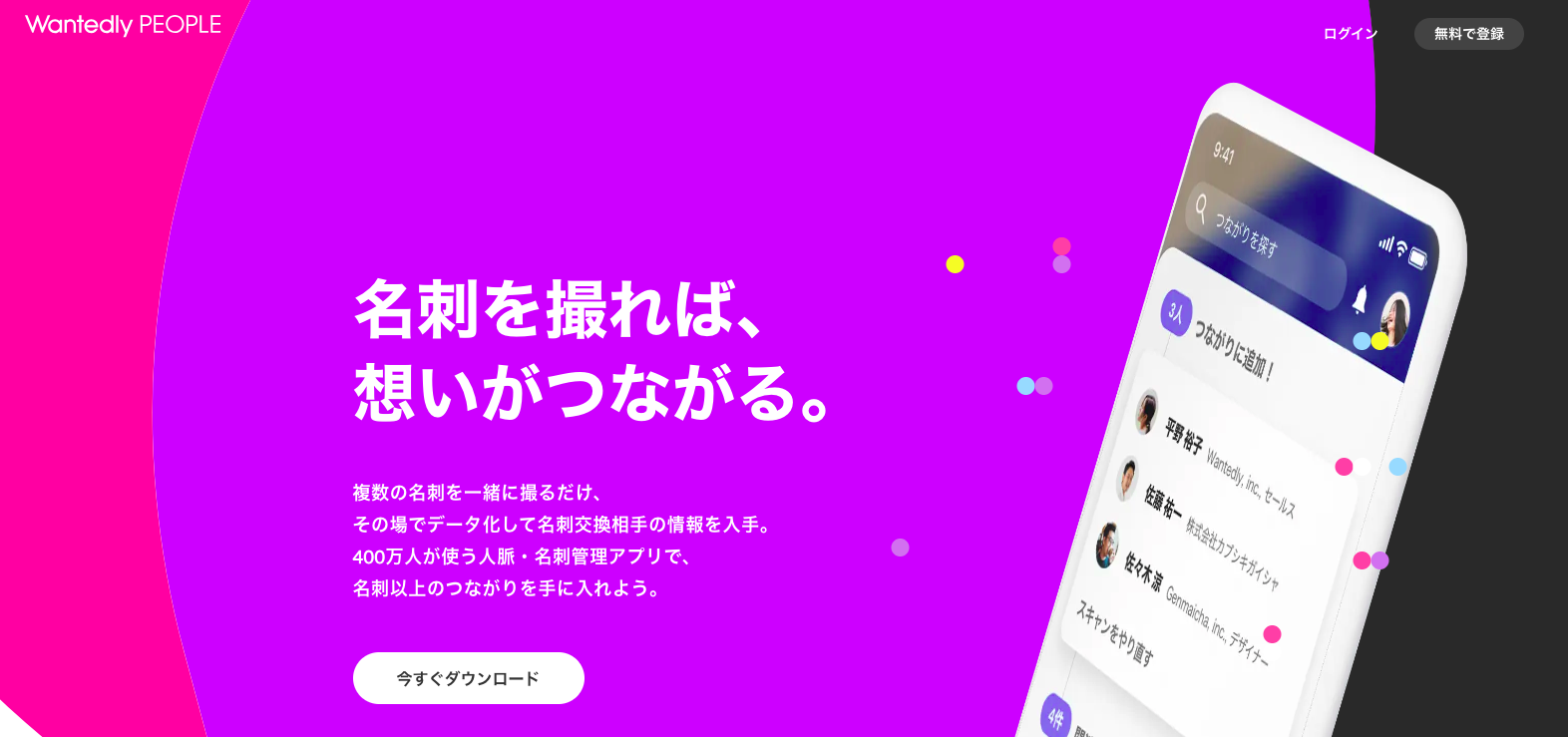 150万人が利用するビジネスSNS・Wantedlyの名刺管理アプリです。人工知能が解析・データ化してくれるため、動画のように一度に複数枚の名刺を1回の撮影で同時に読み込みが可能です。学習機能もあるため、データの認識・マッチングが、回数を重ねるごとに正確になっていきます。PCからも名刺のデータにアクセスが可能で便利です。