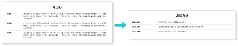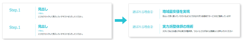 見出しや小見出しなども含まれているパーツなので、テキストの大きさ・太さを変えたり、不要な要素は削除したりして使うことができます。