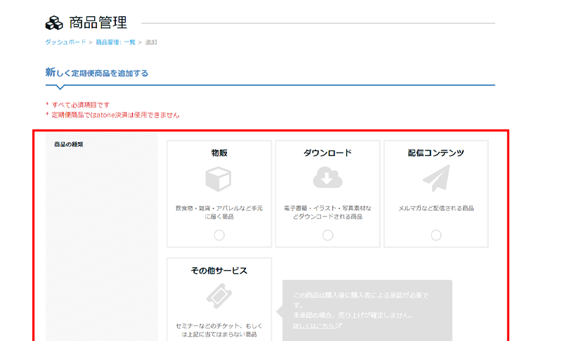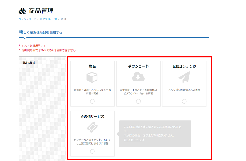 商品の種類も、通常のオンライン決済と同じく「物販」「ダウンロード」「配信コンテンツ」「その他サービス」から選ぶことができるので、有形商材・無形商材どちらも販売することが可能です。
