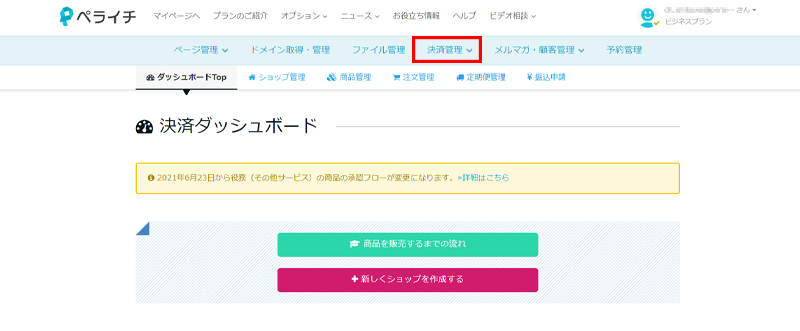 1.マイページ上部にある「決済管理」をクリックし、決済ダッシュボードを開きます。