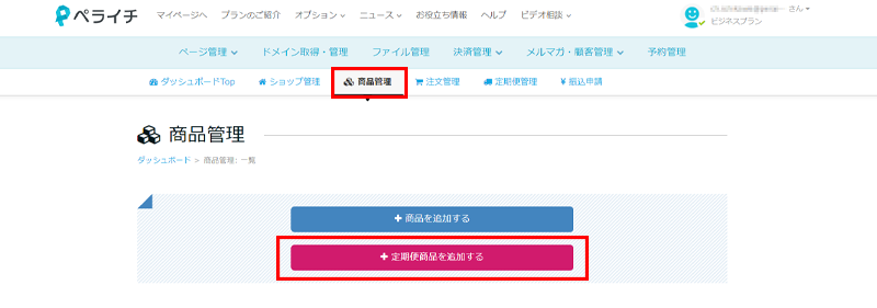 1.決済ダッシュボードメニューの「商品管理」をクリックし、「+定期便商品を追加する」をクリックします