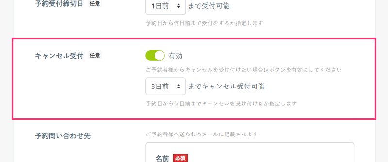 また、オーナー側は予約者キャンセルの有効/無効が選ぶことができ、有効の場合「いつまでならキャンセル可能か」も設定することができます。