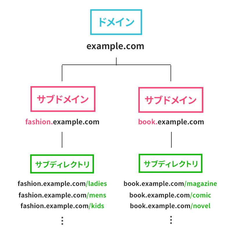 例えば、1つのドメインでネットショップを運営していたとして、服カテゴリのページのサブドメインは「fashion」、本・雑誌カテゴリのページのサブドメインは「book」というふうに区分けすることができます。