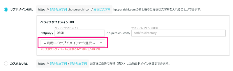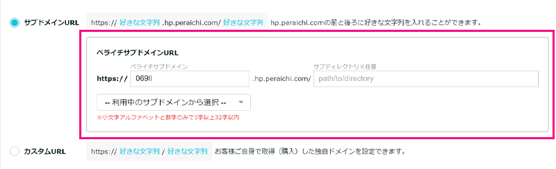 デフォルトの設定としてペライチサブドメインが選択されていますが、独自ドメインを使いたい方はすぐ下の「カスタムURL」を選択してください。