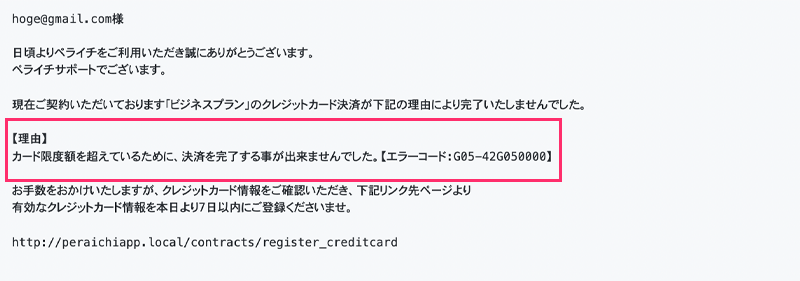 ペライチ利用料支払いにクレジットカードを使用していて、カードの有効期限切れなどで決済ができなかった場合のメール文言に失敗理由が追加されました。