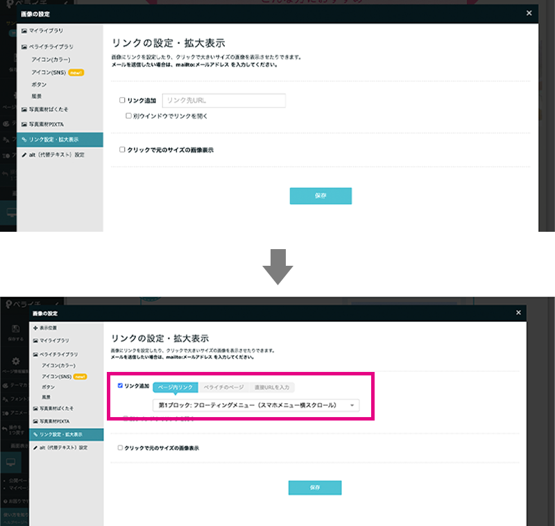 画像設定にある「リンクの設定・拡大表示」のリンク設定はこれまで直接リンクのみ対応になっていましたが、「ページ内リンク」「ペライチのページ」も選べるようになりました。