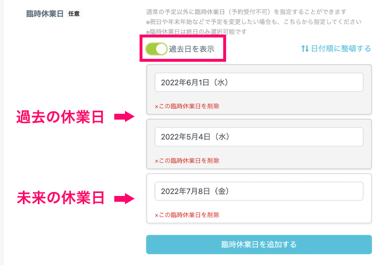 臨時営業日と臨時営業日で指定した日付を、全表示にするか過去日は非表示にするかが選べるようになりました。