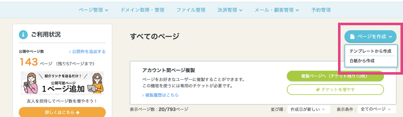 「白紙から作成」と「テンプレートから作成」がマイページの「ページ作成」ボタンから選べるようになりました!