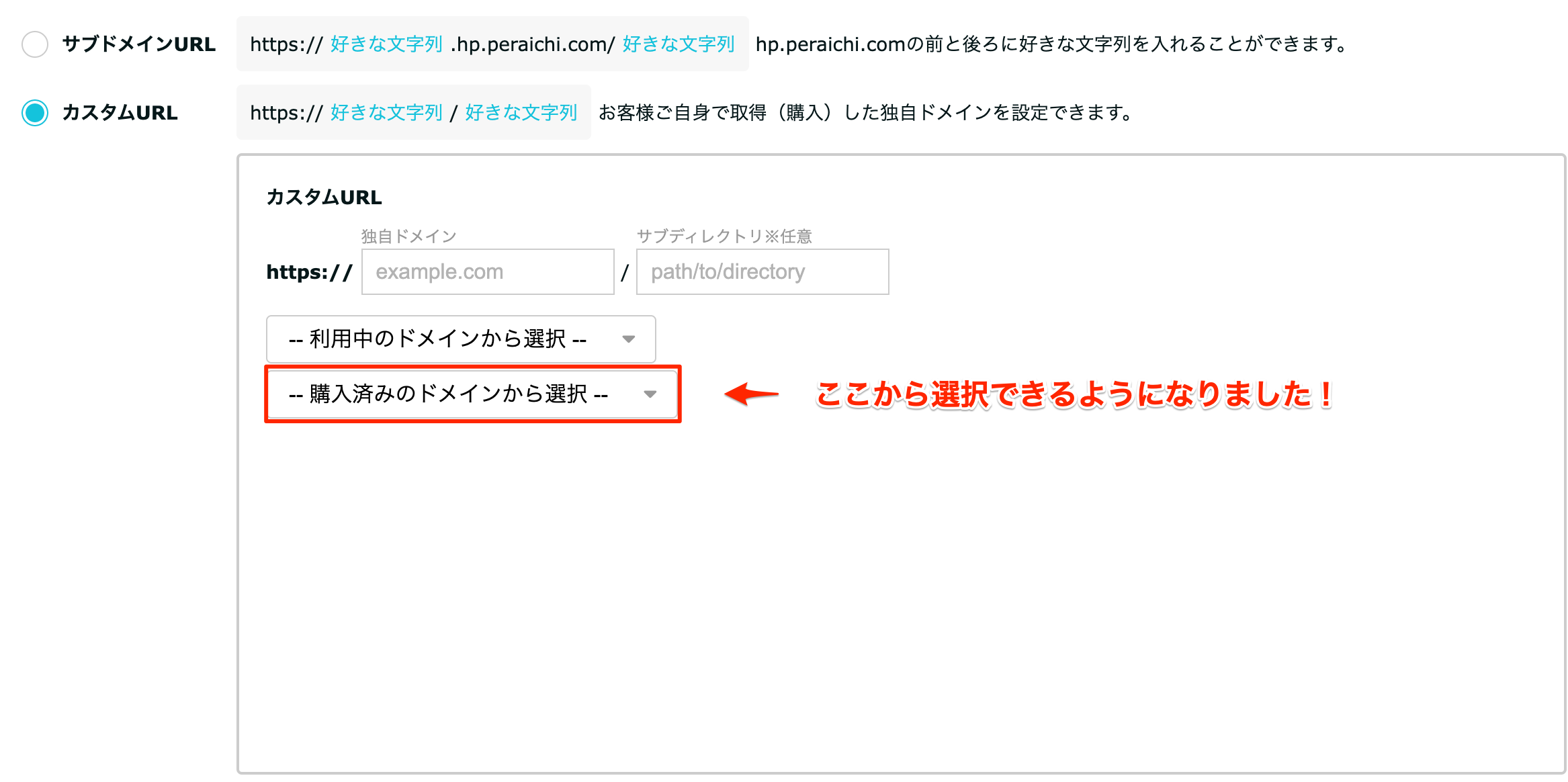 ペライチで購入したドメインであれば、編集画面から選択して設定できるようになりました^^