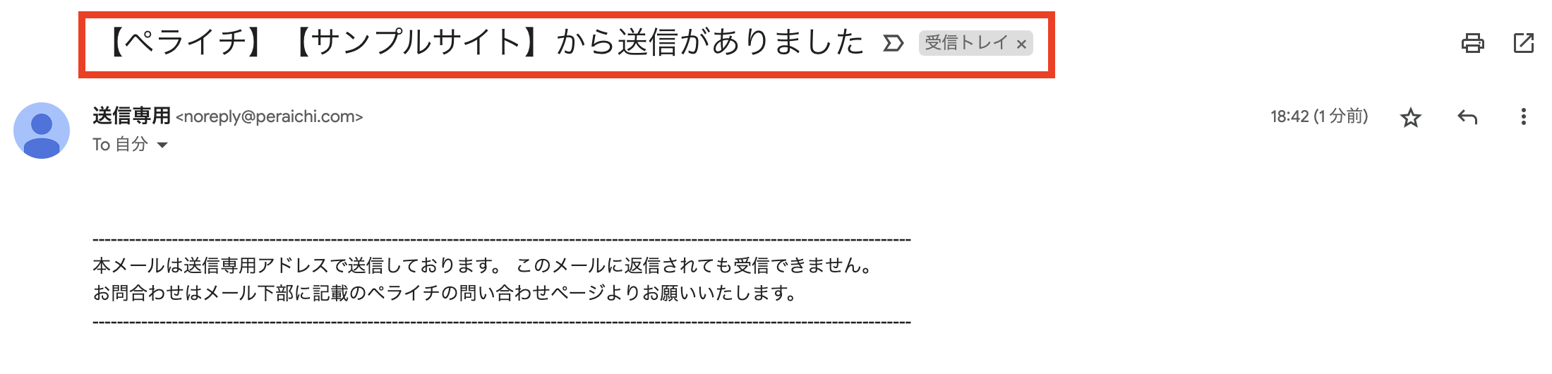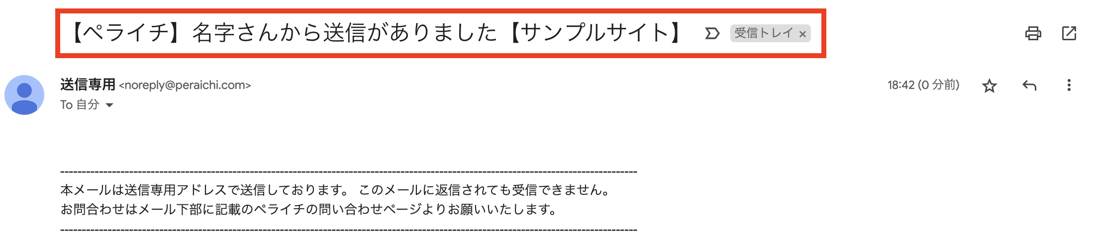 もし、フォームにカテゴリー「名前(姓)」の設定が無い場合は、「【ページ名】から送信がありました」とタイトルが変わります。