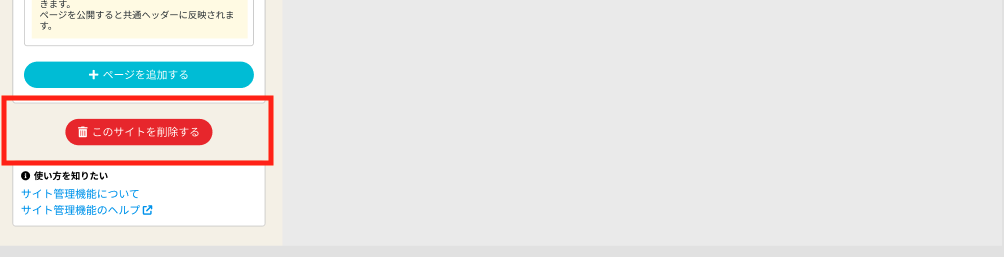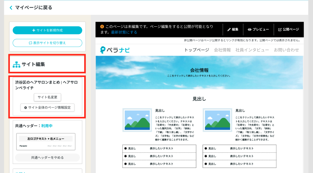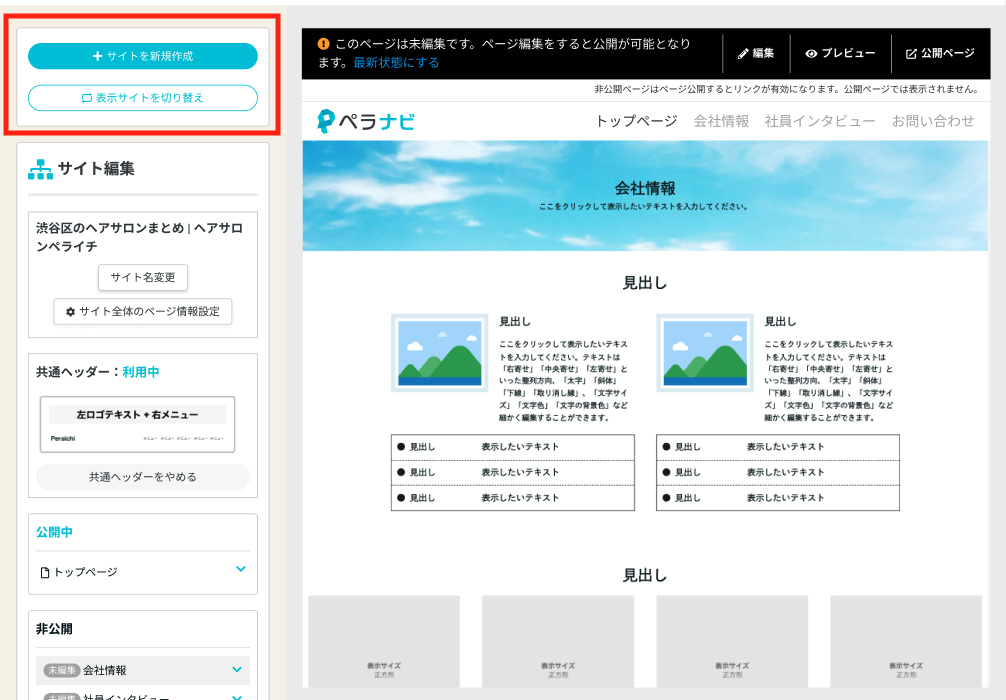 左メニューに「サイトを新規作成」「表示サイトを切り替え」の2つのボタンが登場。他のサイトを作成や既存サイトの表示もラクラクできます♪