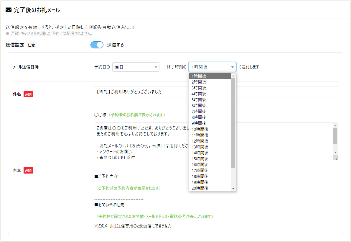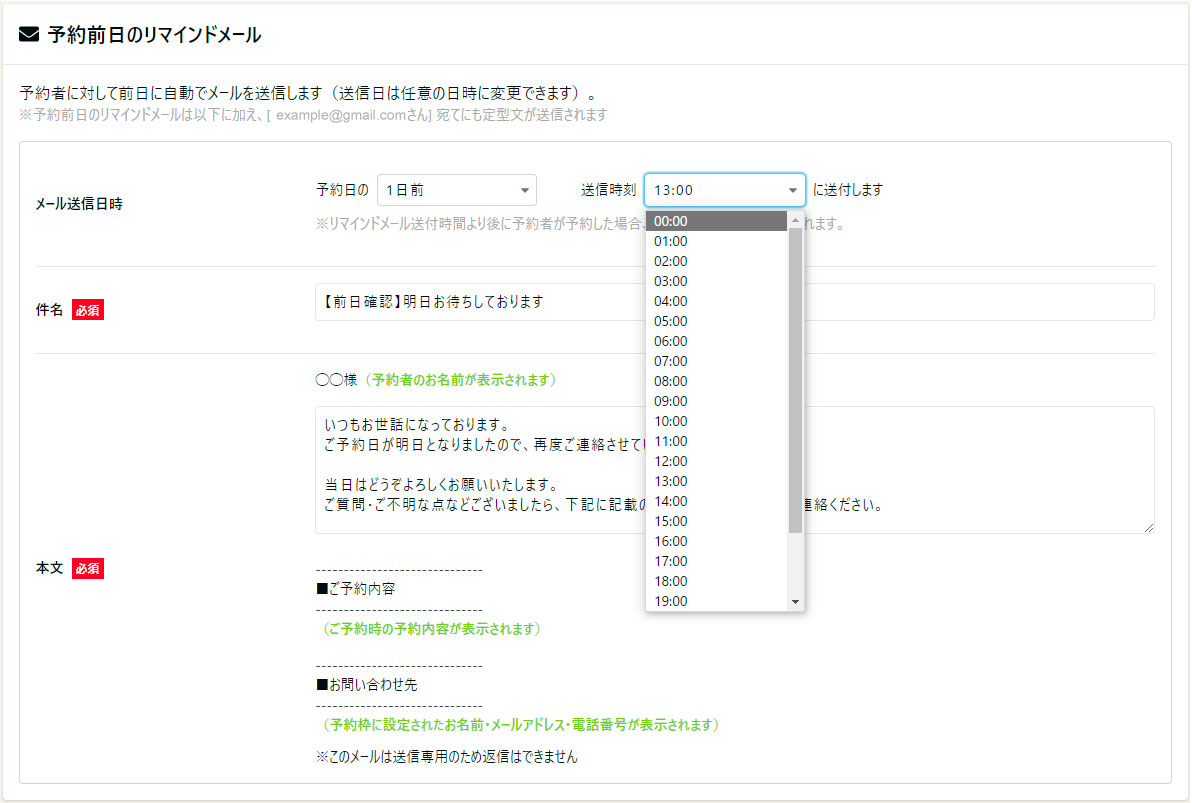予約前日のリマインドメールもしくはお礼メールを送付する際に、自動で送信する日と時間帯を選べます!