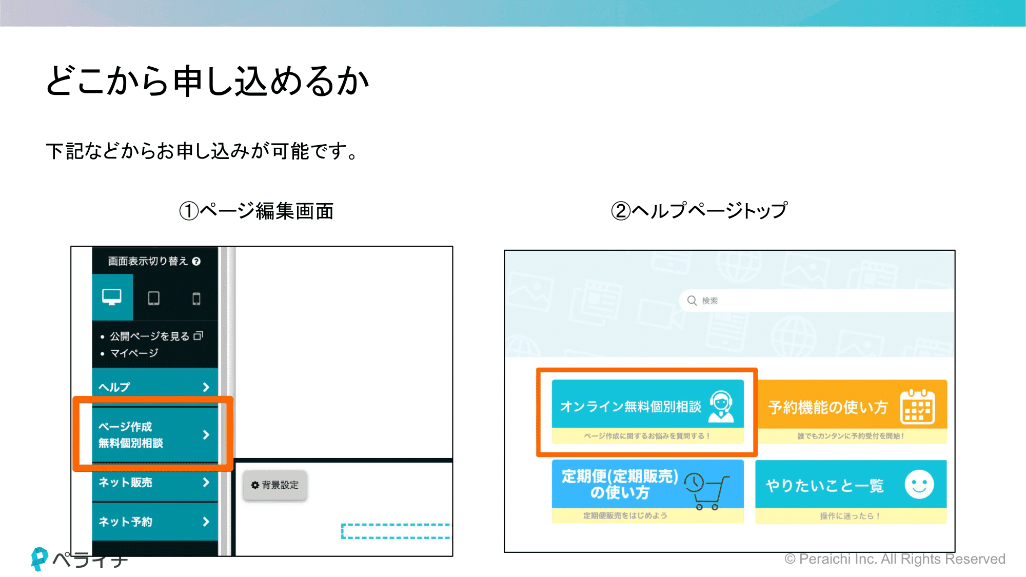 ペライチではページ作成などの基本的なものから集客などのビジネスに関するものまで幅広いオリジナルセミナーを開催しています。