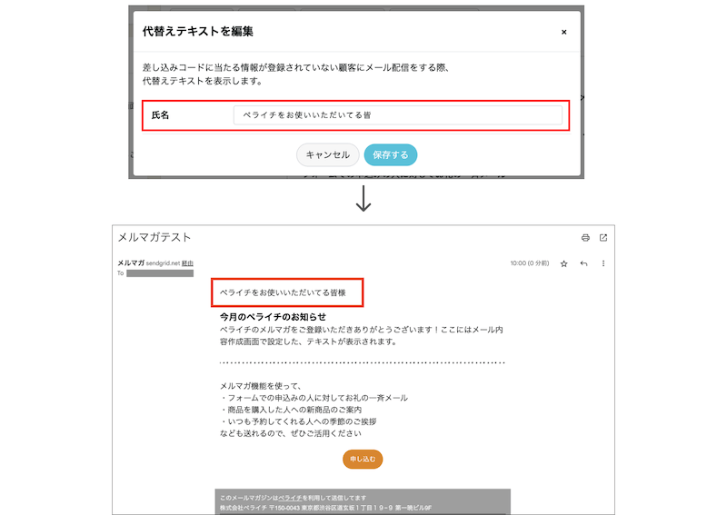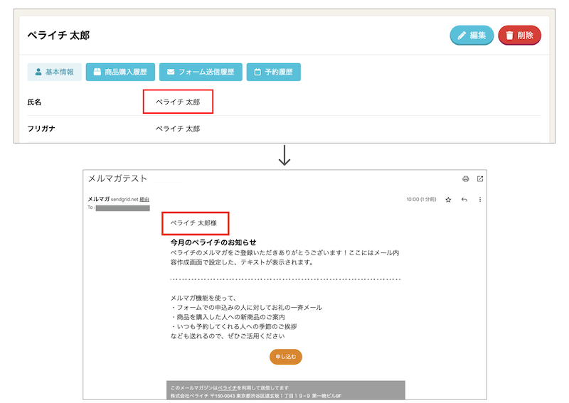▼@@name@@の部分が、顧客データに登録された名前に変換。