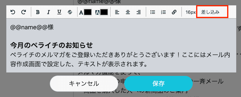 ▼メール本文の差し込みをクリックすると、メール本文に「@@name@@」が挿入されます。