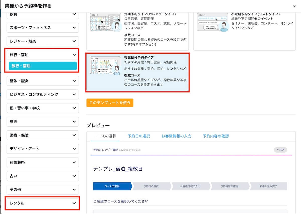 また、かんたん新規作成にて、業種「旅行・宿泊」「レンタル」のテンプレートもご用意しています。