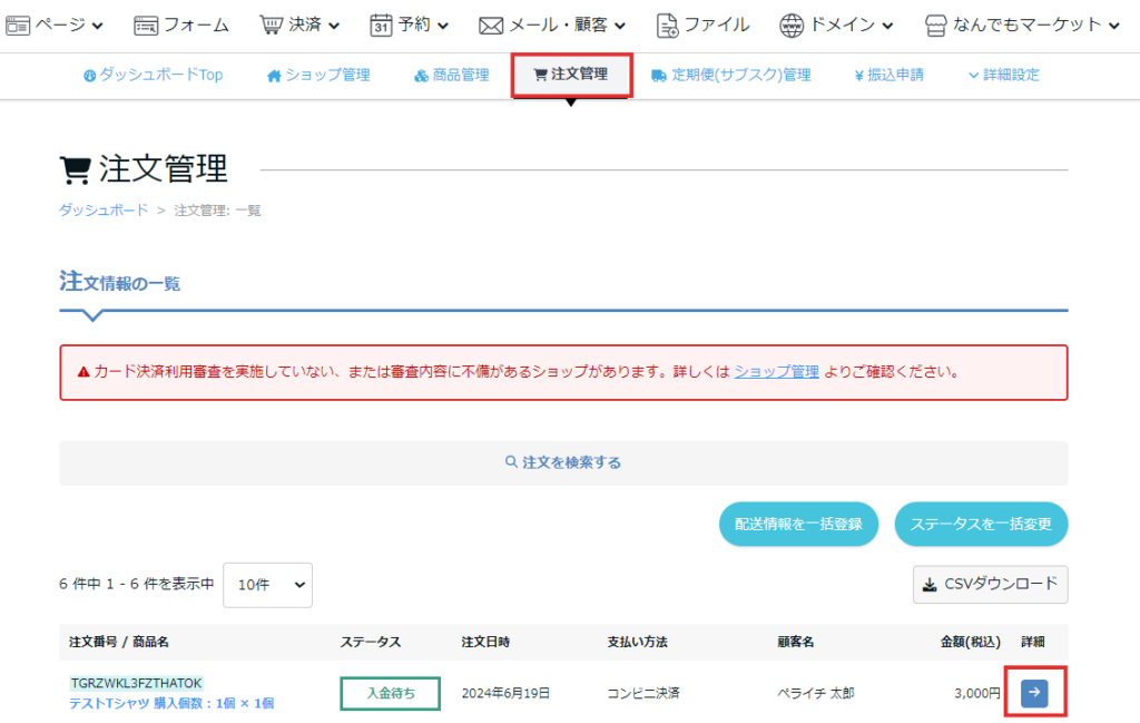 また、配送情報の登録/編集/削除は、注文詳細画面からも行うことが出来ます。注文詳細画面の「→ (矢印) 」ボタンをクリックすることで、配送情報管理画面へと移動することが出来ます。