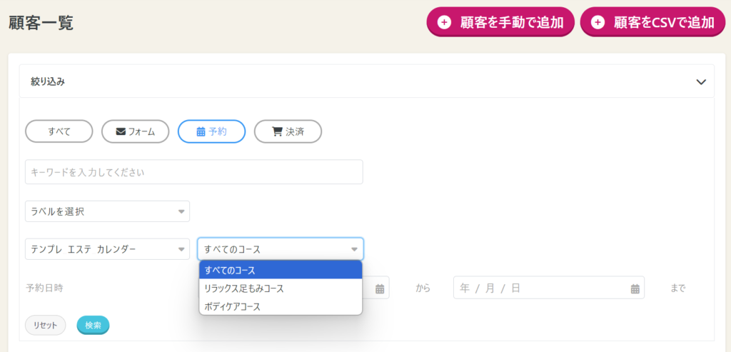 4顧客一覧画面から予約コースごとに絞り込みが可能になりました