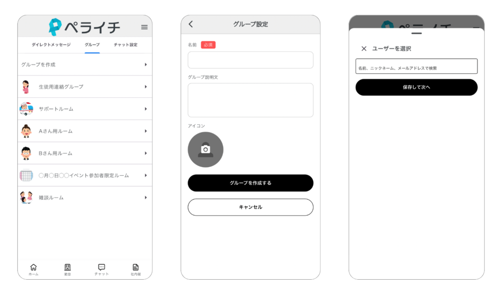 アプリ利用者同士でメッセージグループを作成して、グループ内で自由にコミュニケーションを取ることができます。