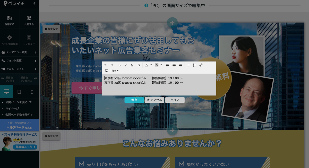 最初からセミナーやイベントを想定した例文が入っているので、文章を書き換えるだけで自然と告知ページを作る事ができます。
