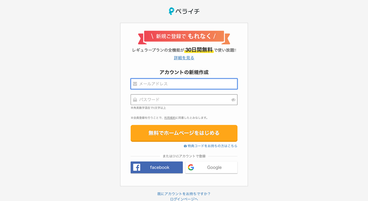 ペライチでセミナー・イベントページを作るにはまず新規登録をしましょう。