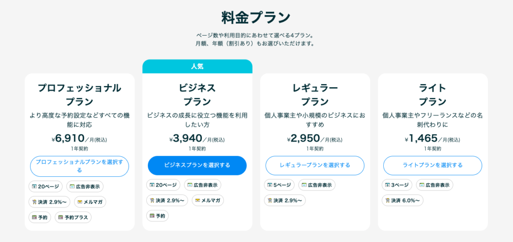 ペライチは、月額1,628円(税込)のライトプラン、月額3,278円(税込)のレギュラープラン、月額4,378円(税込)のビジネスプラン、月額7,678円(税込)のプロフェッショナルプランといった4つのプランがあります。