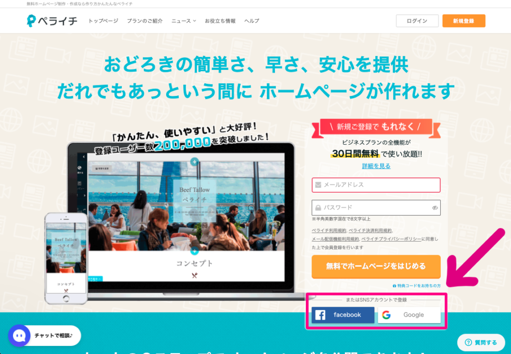 トップページで「新規登録」、またはメールアドレス・パスワードの2つを入力して「無料でホームページをはじめる」をクリックします。